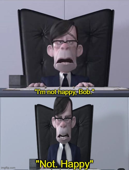 Obviously, that’s no good. You can’t just leave it there, and he wouldn’t want you to leave it at that either. It’s not enough to know THAT your boss is unhappy, but you need to know WHY your boss is unhappy. So, you should probably ask him a question, like, “why?” But if he’s anything like Mr. Incredible’s boss, not any “why?” question will do. Be specific, Bob.