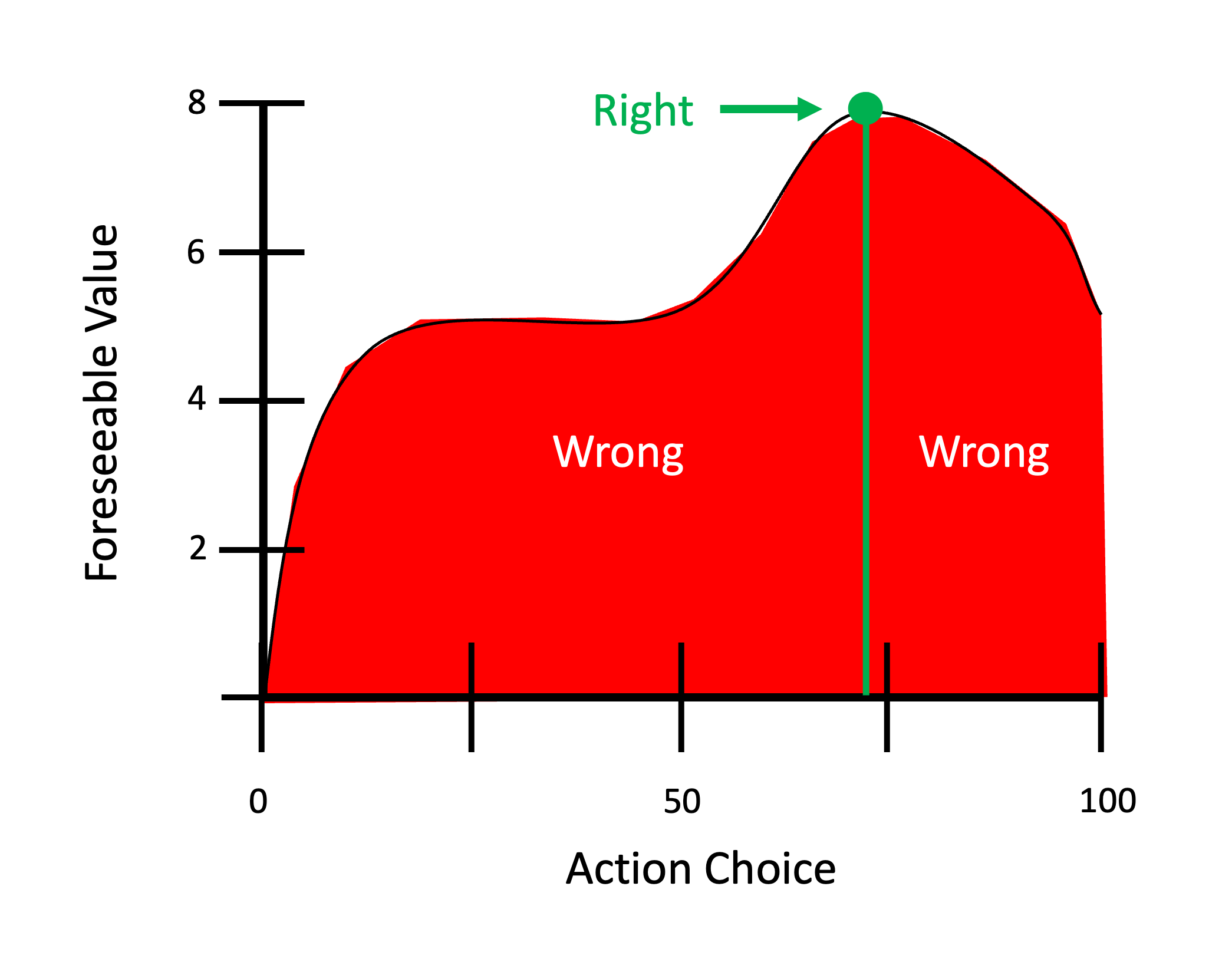 Like any good scientist, I like to have a visual representation of things where possible. So, look at this graph.3 Don’t take the quantitative aspects too seriously (or the shape of the curve, or the fact that it’s continuous or positive, etc.), but I just want to present the main idea. The idea is that you compare how much good will result from some action with any other possible action, and the right action is the one that is better than or at least as good as the rest, while all other actions are wrong because they are non-optimal. If you knowingly do worse than what you could do, that is morally wrong.
